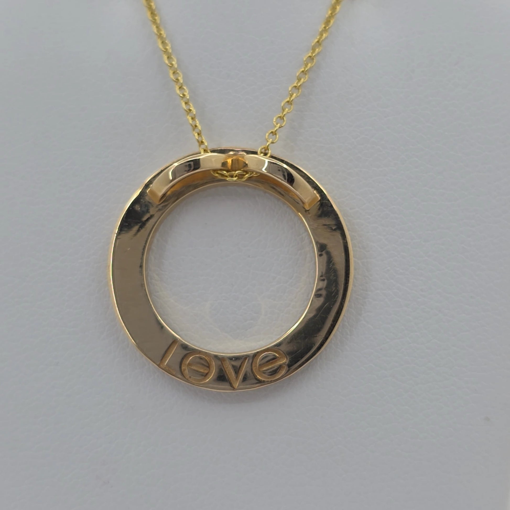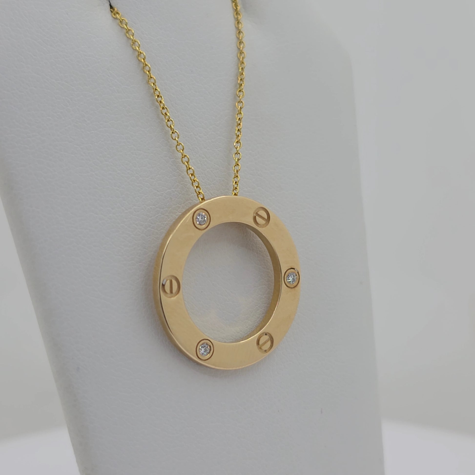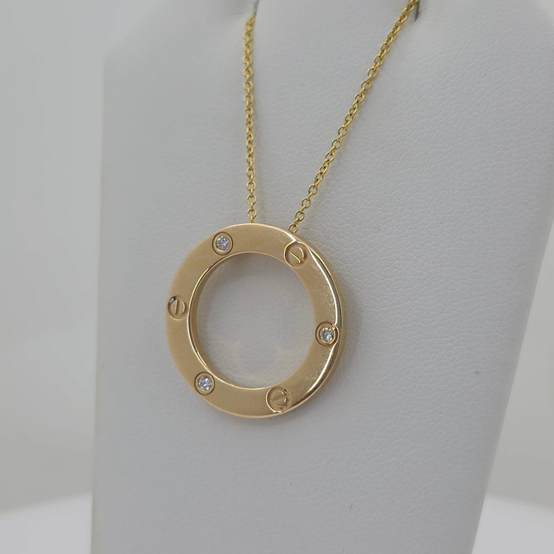 Celebrate love with this elegant 14KT Yellow Gold “Love” Necklace. The pendant features a sleek “Love” design, beautifully accented with lab grown round diamonds totaling 0.07ct for a touch of everyday sparkle. Measuring 23.07mm in diameter, this piece is the perfect balance of modern style and timeless elegance.