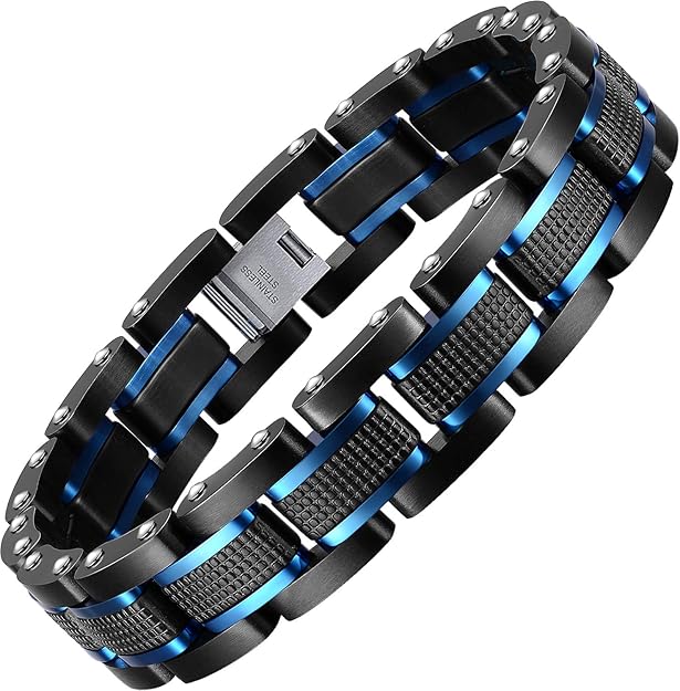 Mens Black And Blue Carbon Fiber Black Stainless Steel Bracelet With Black Cubic Zirconia