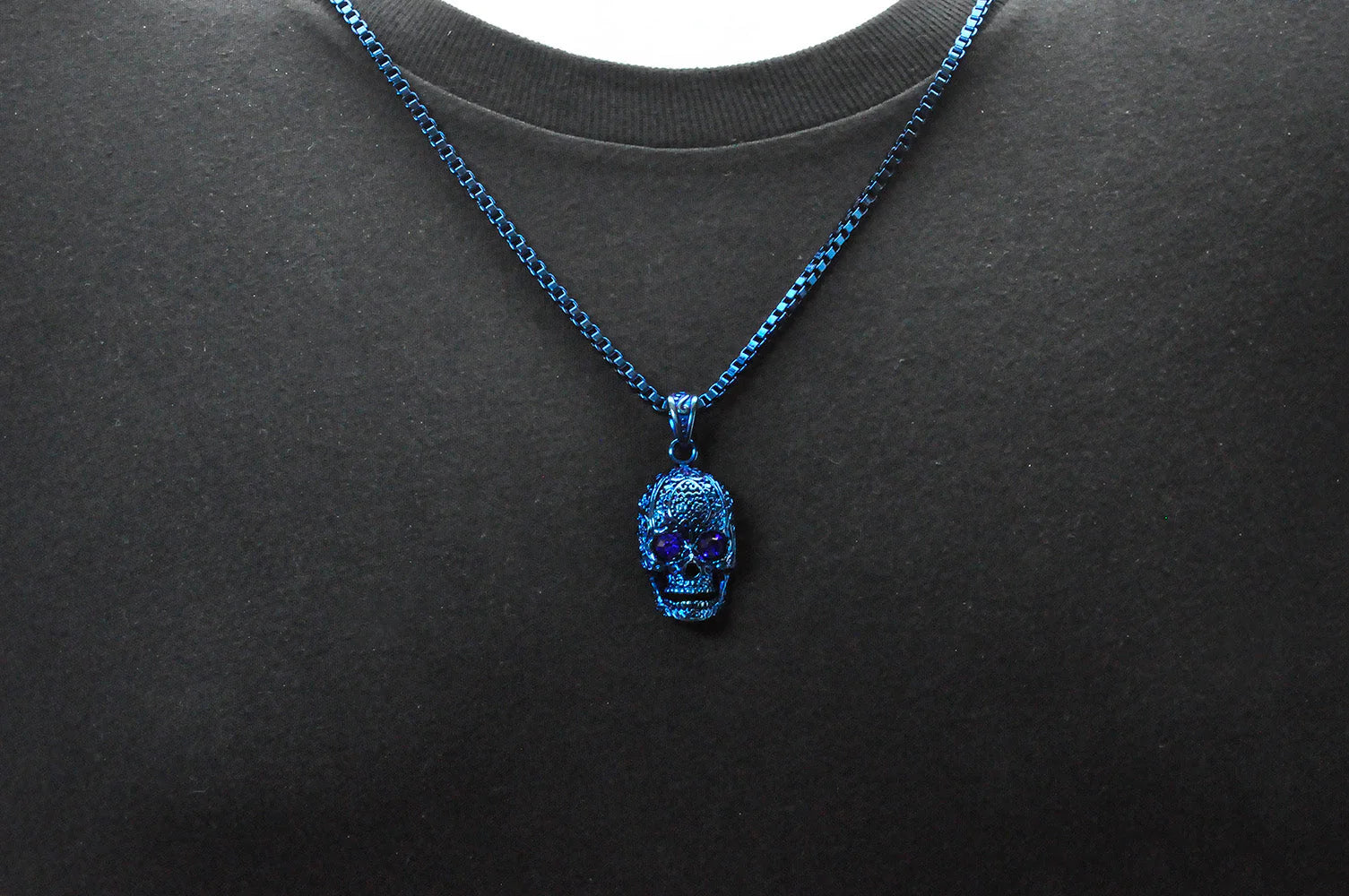Mens Blue Stainless Steel Skull Pendant With Black Cubic Zirconia